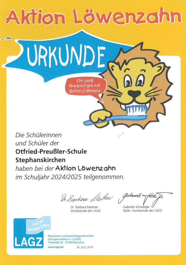Auch in diesem Schuljahr beteiligten sich unsere Grundschulklassen wieder an der Aktion „Löwenzahn“ der Landeszentrale für gesundheitliche Aufklärung. Als Anerkennung für so viel Eigenverantwortung für die eigenen Zähne und als Dank an alle Lehrkräfte, die neben ihren vielen unterrichtlichen Aufgaben immer wieder an die Abgabe der Löwenzahnkarten erinnert haben, bekommen wir nun diese URKUNDE verliehen. […]